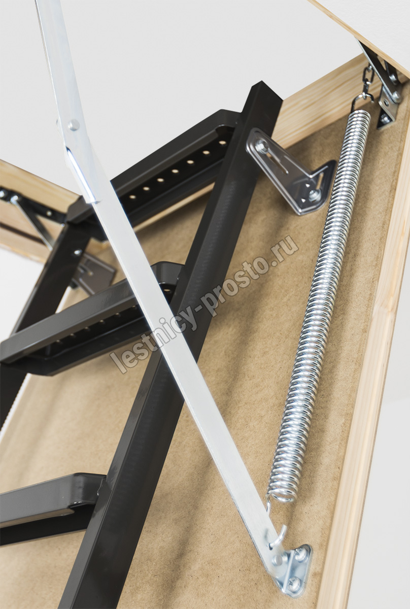 Герметичность всей конструкции достигается благодаря утеплению крышки люка и контурному уплотнению по периметру, что предотвращает возможные теплопотери. Чердачную лестницу очень легко разложить и сложить благодаря наличию специального стержня с четырехугольной насадкой. Установленные в лестнице угловые петли-шарниры нового образца придают ей высокую прочность и надежность, а также предохраняют короб от возможной деформации. Основное преимущество чердачной складной металлической лестницы LMS сводится к ее небольшим габаритам при сохранении высокой функциональности, прочности, надежности и эстетичности конструкции. Монтировать лестницу очень просто, для этого не придется затрачивать много времени и сил. Применение лестничной конструкции этого типа позволяет существенно экономить пространство. Монтажный комплект LXK в комплекте не поставляется.