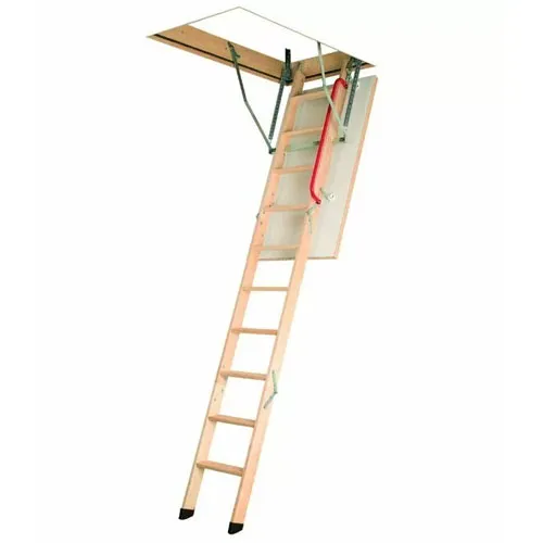 Лестница складная трёхсекционная, изготовлена из сосны. Термоизоляционная крышка типа "сэндвич" утеплена пенопластом, облицована с двух сторон ДСП белого цвета. Короб люка с однослойным уплотнителем. Все металлические элементы лестницы покрыты порошковой краской, ступени лестницы имеют антискользящие насечки и закреплены в столярное соединение «ласточкин хвост», что позволяет выдерживать нагрузку  до 150 кг. Деревянный стержень для открывания лестницы в комплекте.