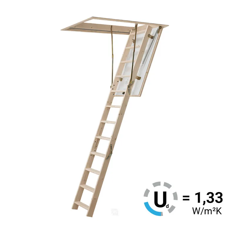 Все элементы лестницы выполнены из экологически чистых материалов и обработаны веществами, не содержащими тяжелых металлов. На ступенях антискользящие насечки. Короб лестницы изготовлен из металла. Термоизоляционная крышка типа "сэндвич" утеплена пенопластом, облицована с двух сторон ДСП белого цвета. Короб люка с уплотнителем. В комплекте деревянный стержень для открывания лестницы.
