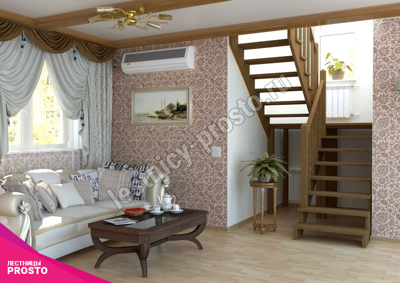 Классическая модель поворотной лестницы раскрывает всю природную красоту натуральных материалов. У лестницы комфортная высота шага, удобный широкий марш и угол подъема. Лестница изготавливается под заказ. Возможны варианты подходящие под разные размеры проёма. Базовое ограждение можно заменить на кованое или точеное. В дополнение можно приобрести бортики, подступени, или мини-подступени. Первую ступень можно заменить на пригласительную - лекальную. Стоимость указана для лестницы без какого-либо покрытия.
