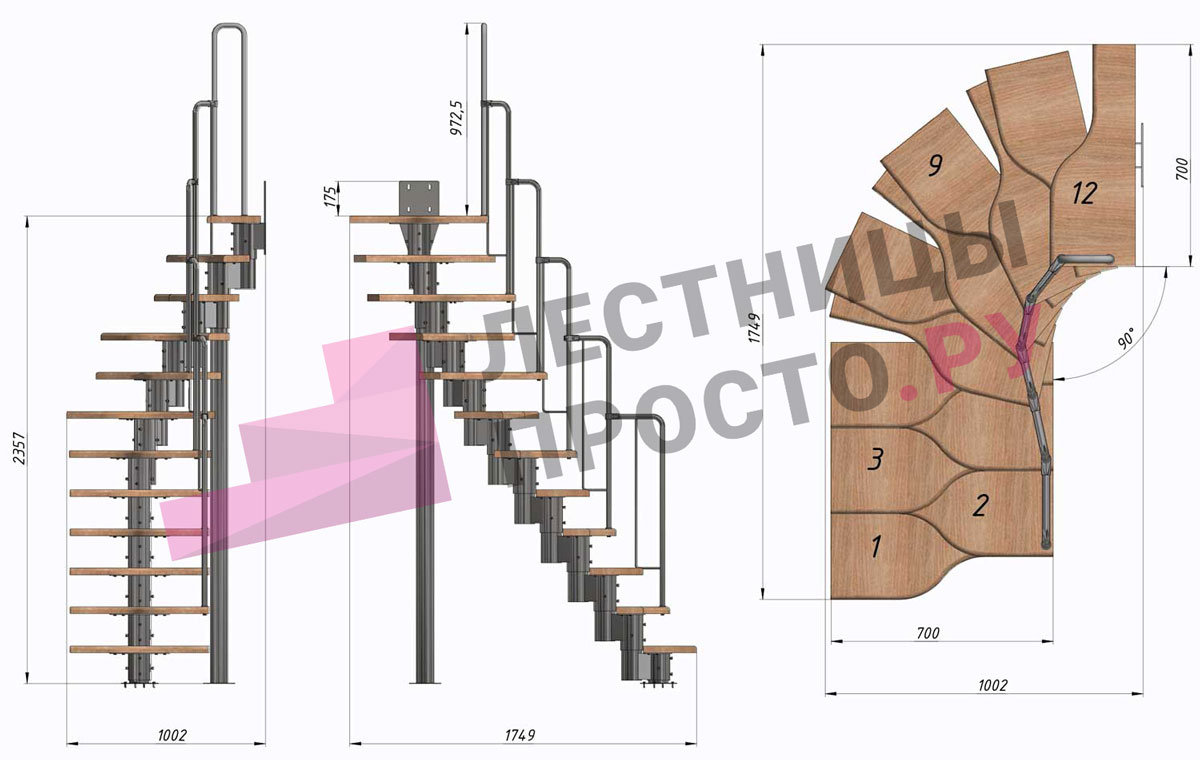 Лестница Prosto Urban Black гусиный шаг 700 мм, h216-312 см (12 ступеней), ясень