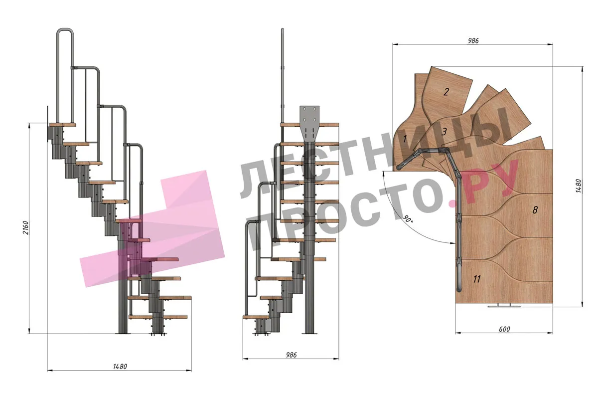 Лестница Prosto Urban Black гусиный шаг 600 мм, h198-288 см (11 ступеней), бук