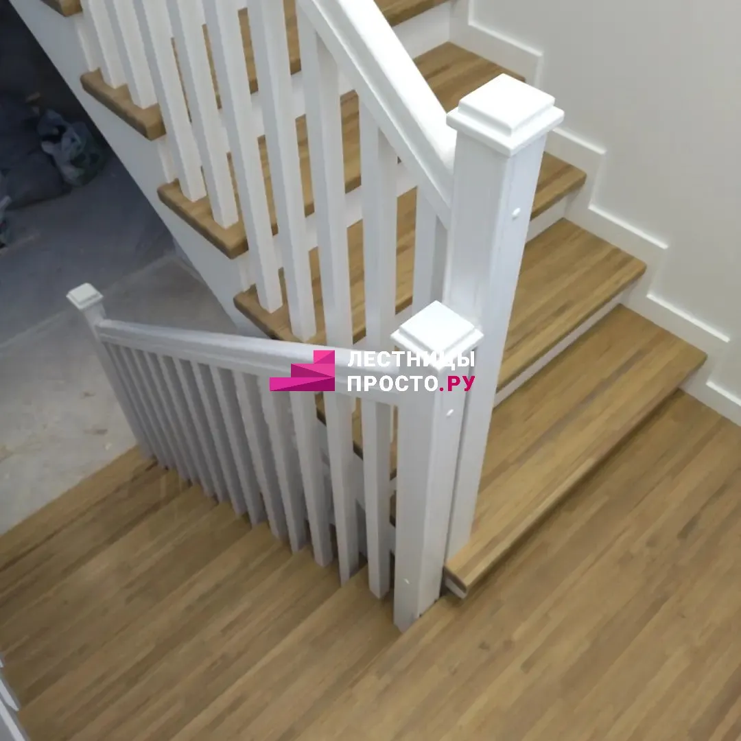 Подступенники, фальш-косоуры, сапожки (пристенной плинтус) декорированы МДФ.